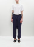 Camiel Fortgens navy blue ankle-length cropped pants with raw details at waist in cotton blend twill. Features an elastic waist, slim slash side pockets and a single flap welt pocket at back. Slight tapered silhouette with a relaxed fit.