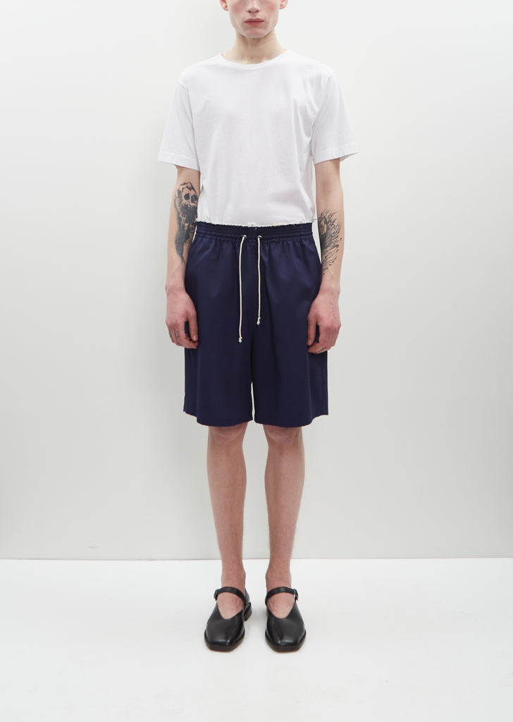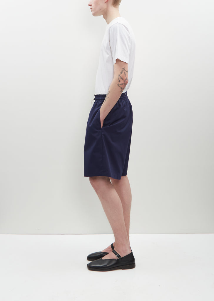 Camiel Fortgens navy blue knee length shorts with a relaxed fit and raw details at waist in cotton twill. Features an elastic waist, slash side pockets and a adjustable drawstring at waist with cord locks.