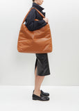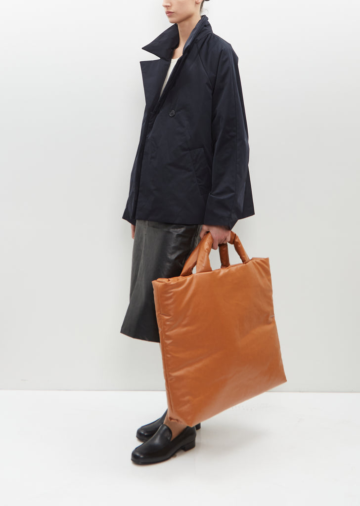 Kassl padded coated canvas large tote in deep camel. Features fixed carry handles and crossbody strap, open top and patch pocket at interior. Comes fully lined in taffeta.