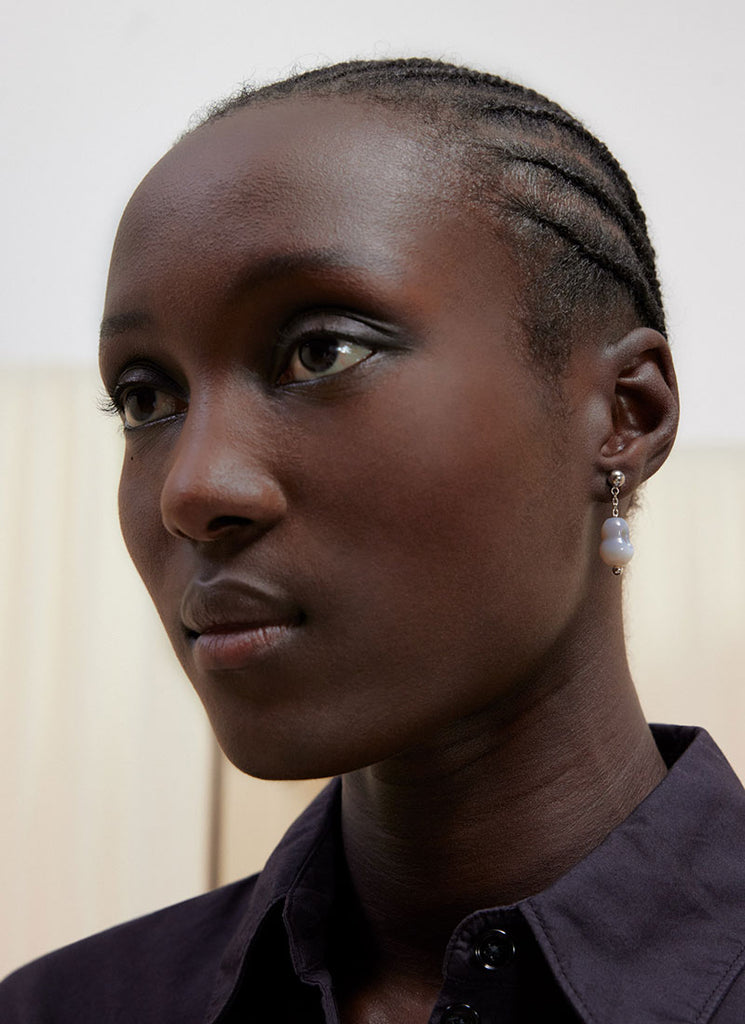 Lemaire pair of drop earrings hand carved from natural agate stone hanging at the end of a 925-sterling silver chain.
