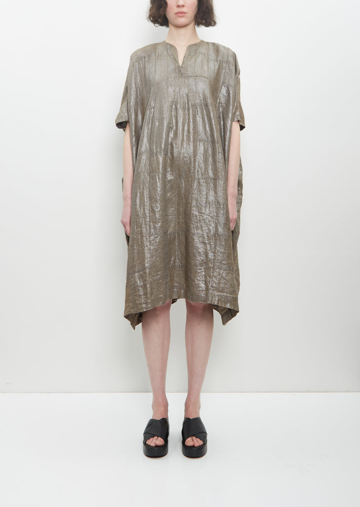 dosa brown relaxed tunic dress with short dolman sleeves in recycled metallic linen patchwork. Features a notched neckline and side seam pockets.