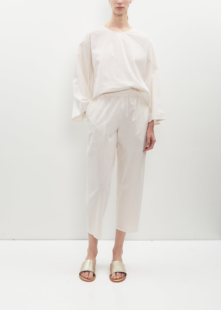 Dušan signature pull on trousers with cropped, tapered legs in natural-tone micro striped gauzy cotton. Features an elasticated waistband and slash side pockets. Easy fit.