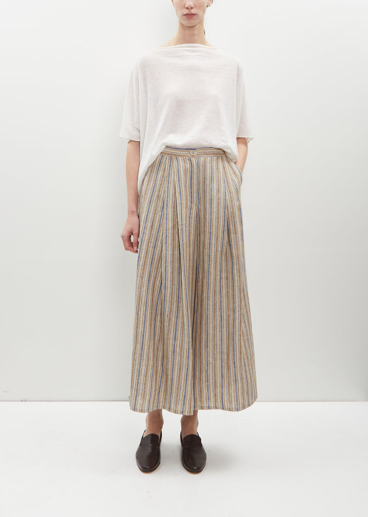 Dušan signature trouser with cropped, wide lgs in beige and blue striped breathable linen. Features a pleated front, slash side pockets and a button and zip-fly fastening. A darted, clean back side for flattering fit.