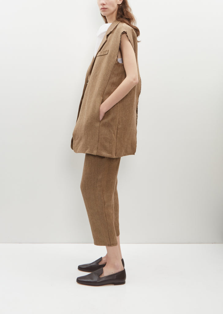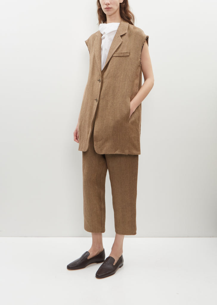 Dušan signature single-breasted sleeveless blazer with overlapping angled panels for an open back in cream and brown toned linen herringbone. Features a single welt chest pocket and two concealed seam side pockets. Comes unlined. Straight silhouette with a relaxed fit.
