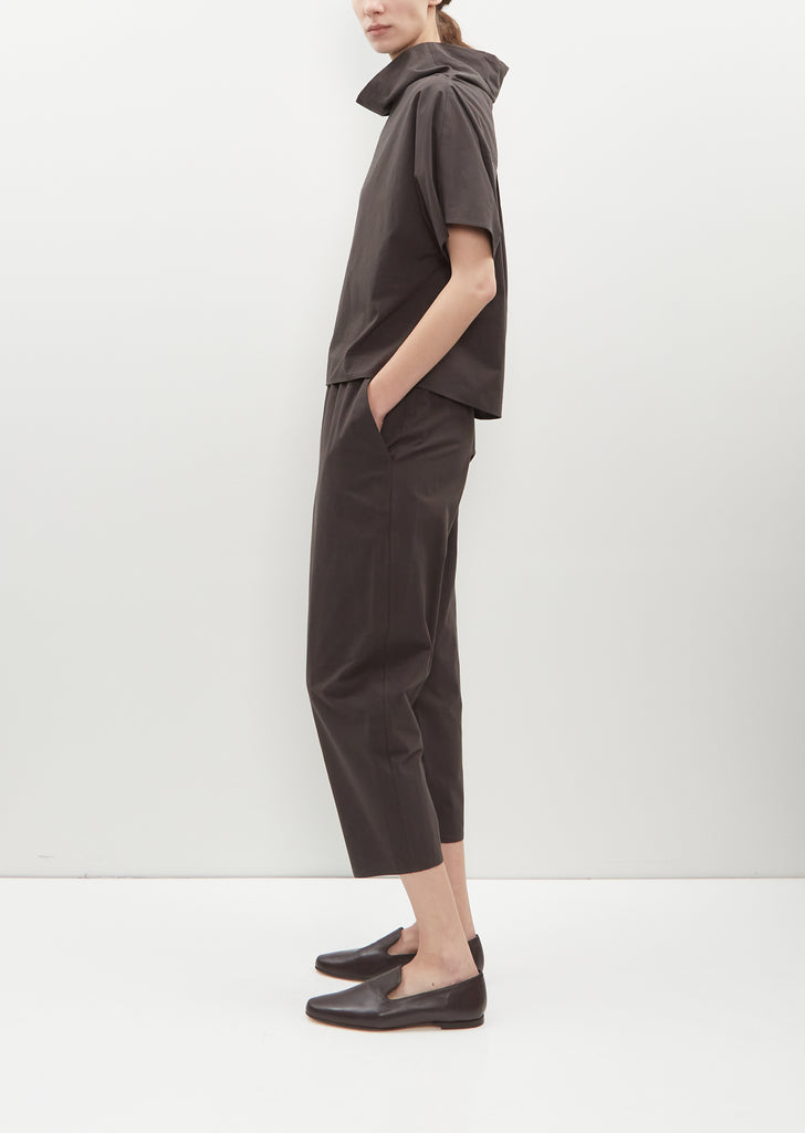 Dušan signature pull on trousers with cropped, tapered legs in chocolate brown mid-weight smooth cotton. Features an elasticated waistband and slash side pockets. Easy fit.