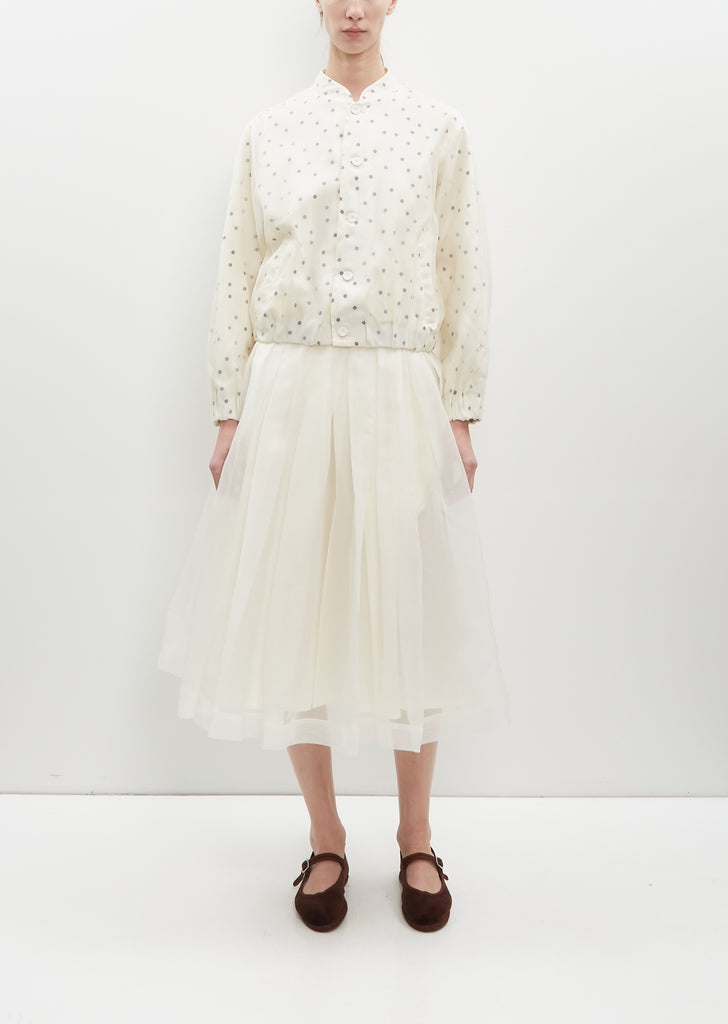 École de Curiosités ivory cotton bomber style jacket with dotted silk overlay. Features a mandarin neckline, elasticated sleeve cuffs and hem. Side welt pockets. Finished with covered buttons in self.