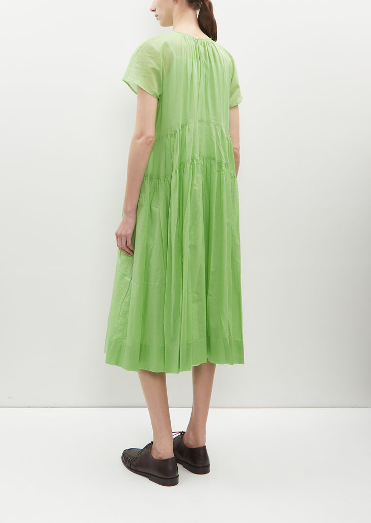 École de Curiosités apple green short sleeve dress with a gathering at neckline and tiered skirt in cotton gauze. Features dolman sleeves, buttoned keyhole at back neckline and hidden side seam pockets. Comes with a slip underlay.