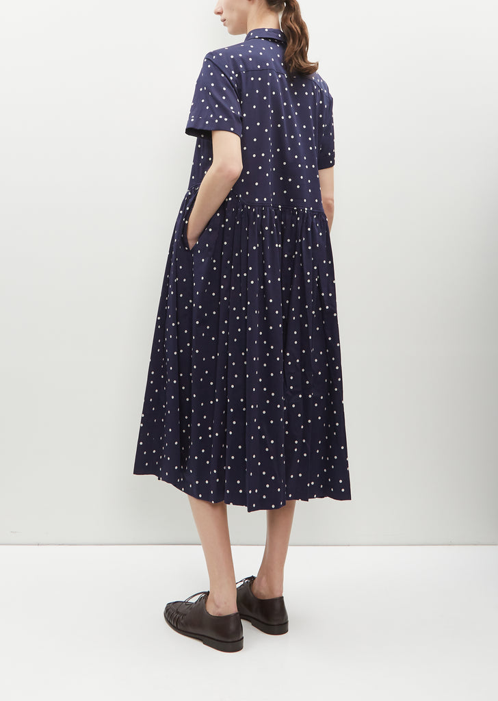 École de Curiosités signature gathered dress with short sleeves in dark navy and ivory polka dot cotton. Features a cub collar, angled waist and hidden side seam pockets. Finished with small contrast buttons.