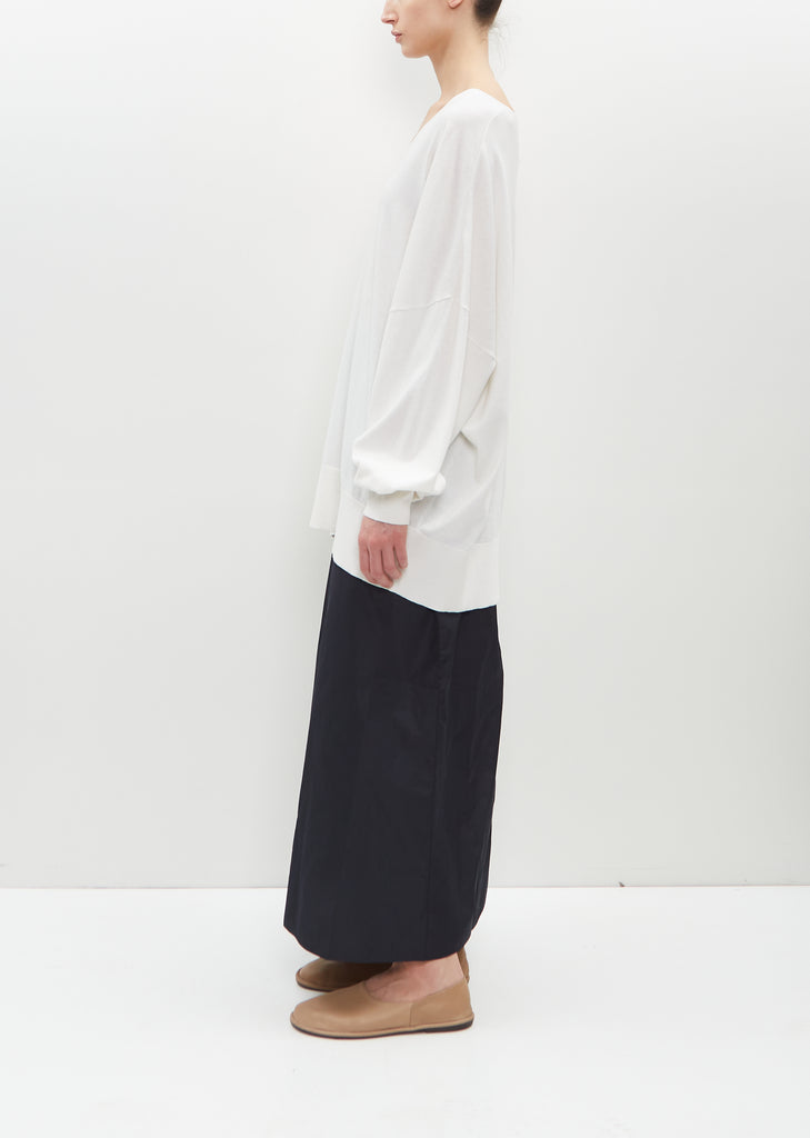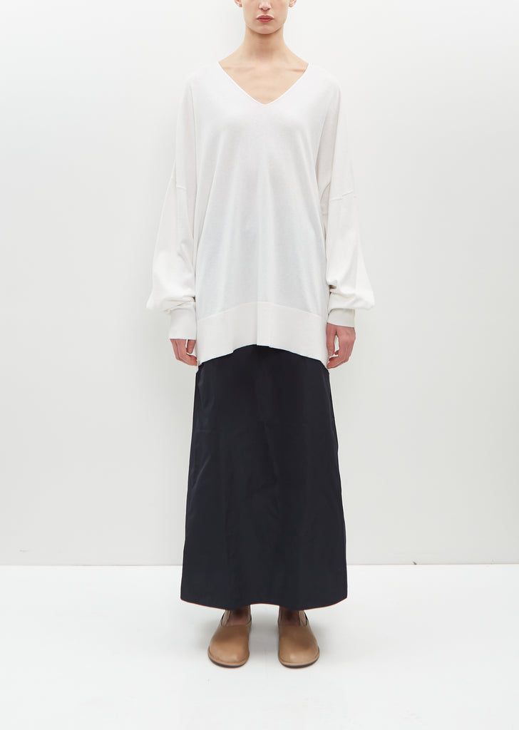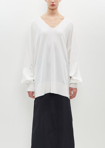 Extreme Cashmere snow white long V-neck sweater with elongated sleeves in cotton-cashmere jersey knit. Features a clean finish neckline with wide rib trim sleeve cuffs and hem.