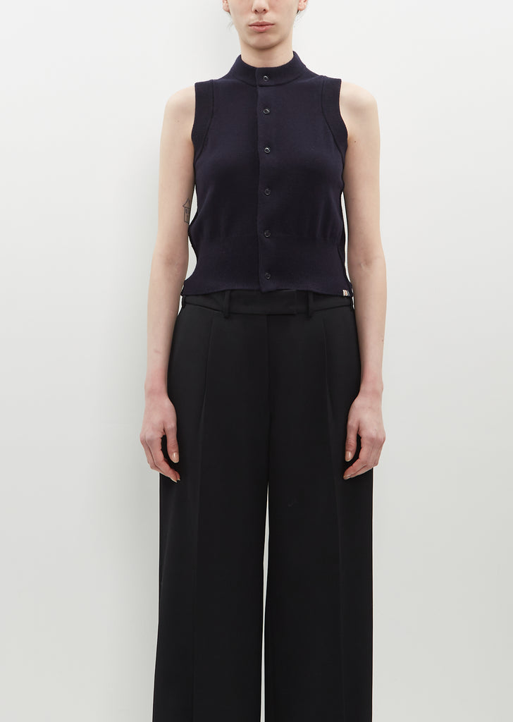 Extreme Cashmere navy sleeveless vest cardigan in a cashmere blend knit Features tonal buttons with rib trim finishes at neckline, inner placket, armholes and hem.