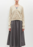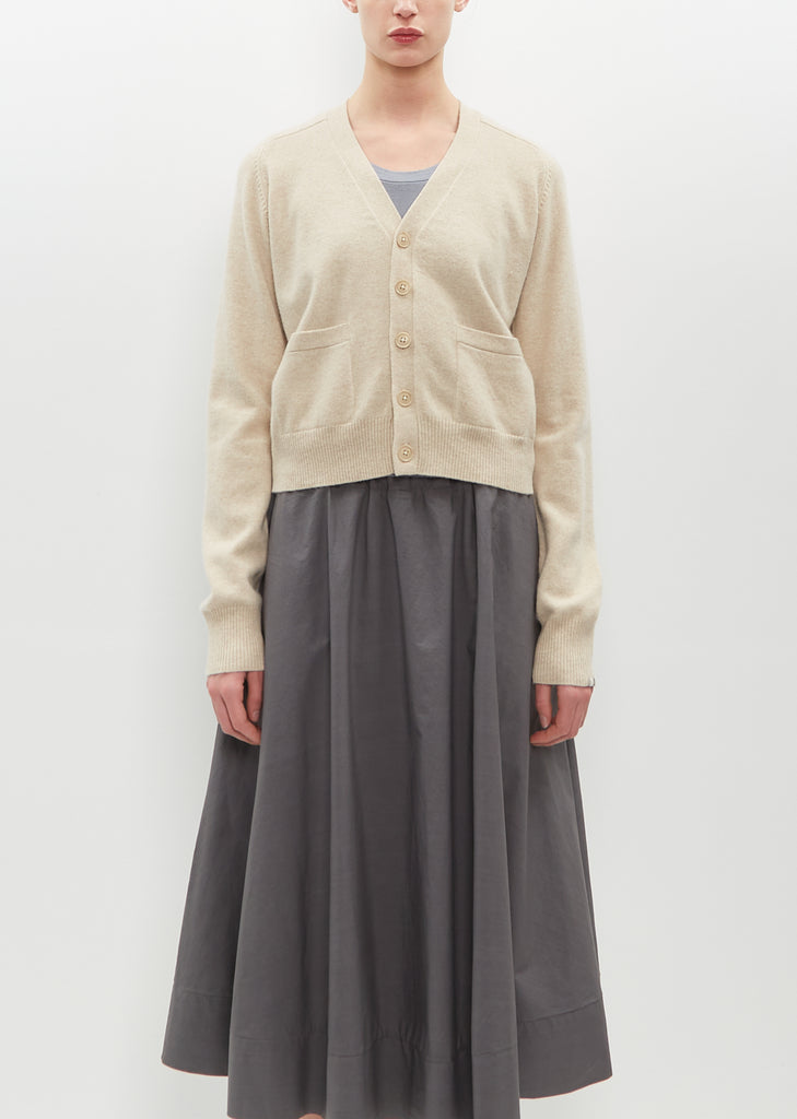 Extreme Cashmere latte V-neck cardigan with saddle sleeves and patch pockets in stretch cashmere blend knit. Finished with rib trim finish at sleeve cuffs and hem.