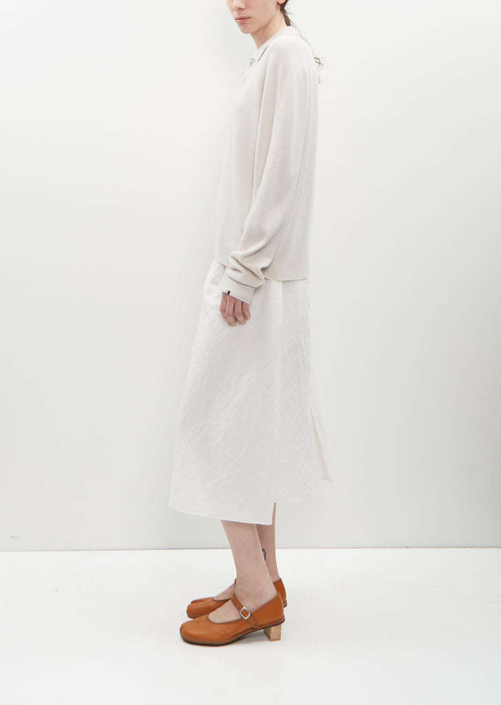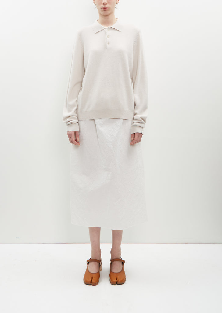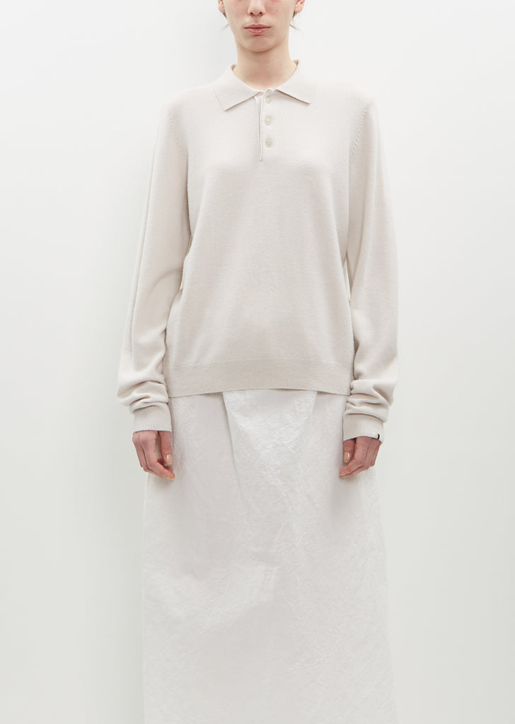 Extreme Cashmere chalk polo sweater with elongated sleeves in stretch cashmere blend knit. Finished with rib shirt collar, sleeve cuffs and hem. Finished with tonal buttons at placket.