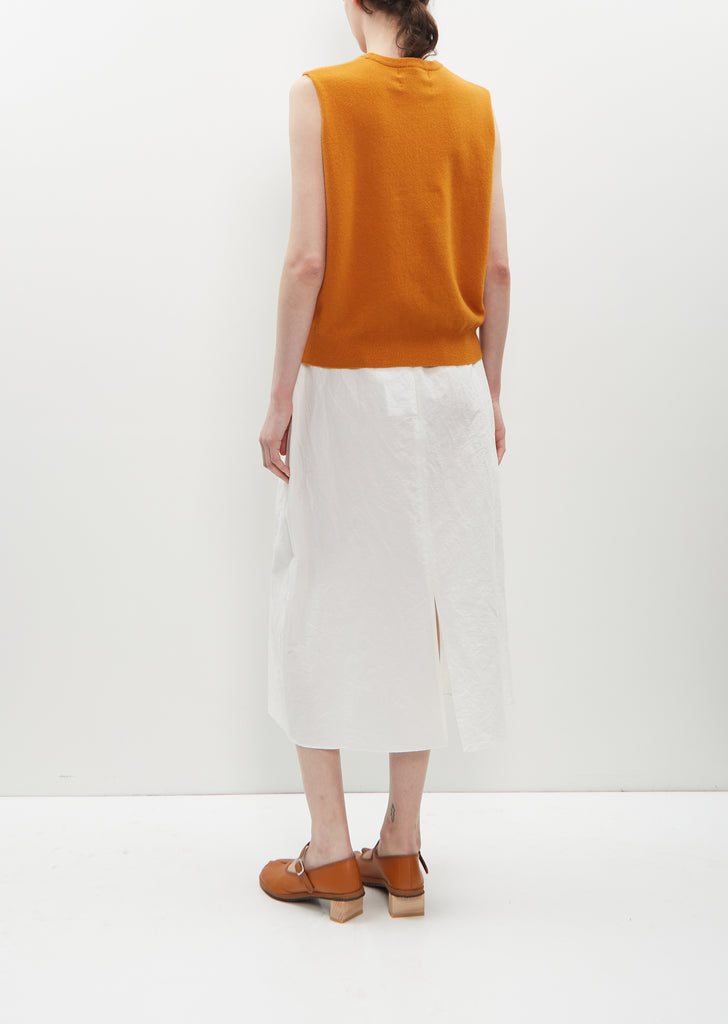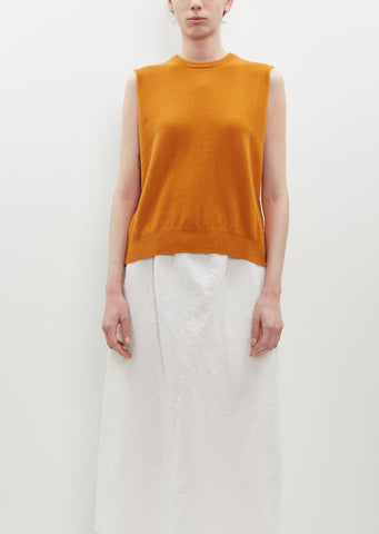 Extreme Cashmere orange vest sweater in stretch cashmere blend knit. Finished with rib trim at neckline and hem, with clean finish armholes. Straight cut with a blouson fit.