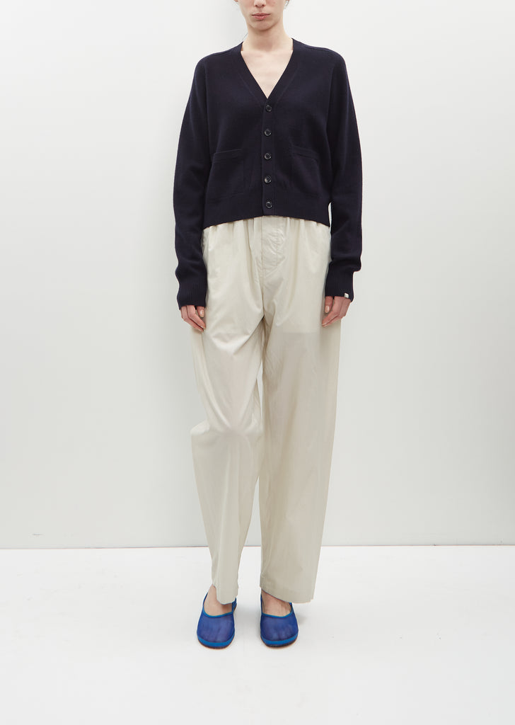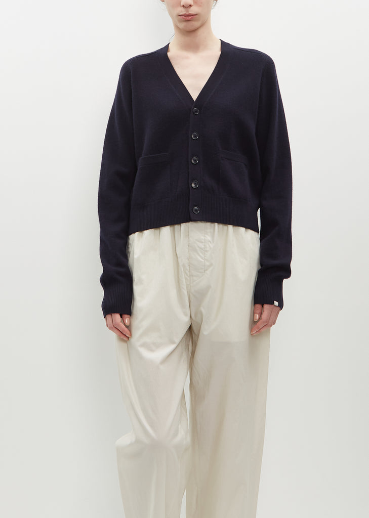 Extreme Cashmere navy V-neck cardigan with saddle sleeves and patch pockets in stretch cashmere blend knit. Finished with rib trim finish at sleeve cuffs and hem.