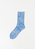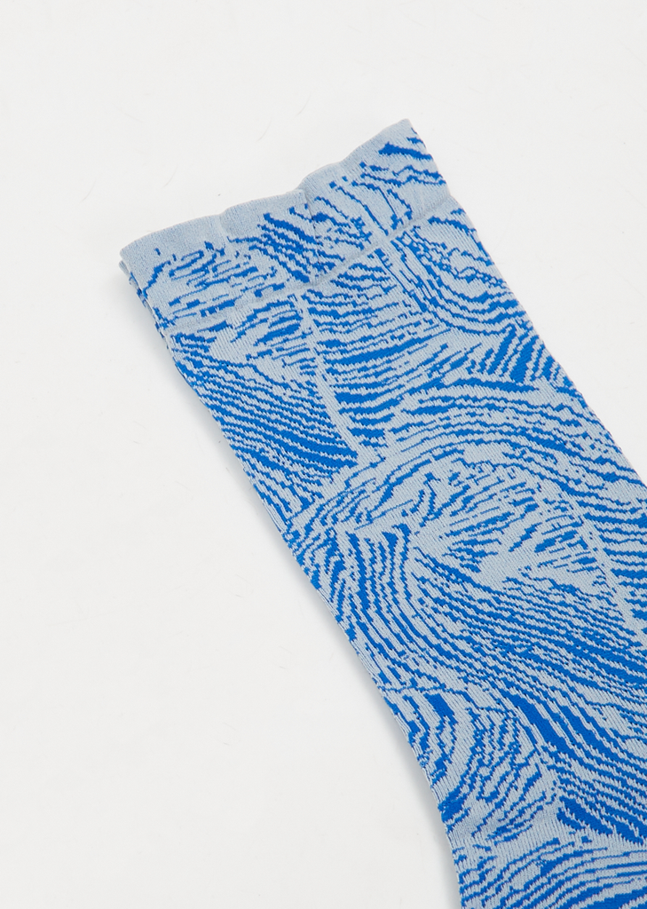 Issey Miyake blue ankle socks in thin knit with a pattern inspired by the surface of baked bread and finished with a scallop trimmed opening.