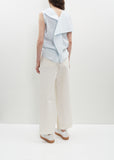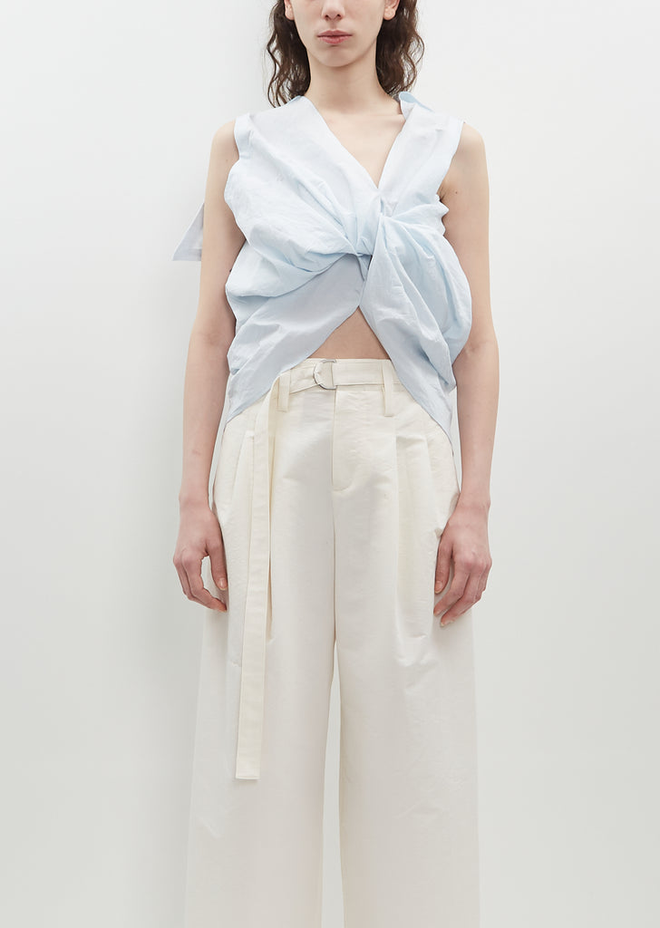 Issey Miyake light blue V-neckline top with a knotted front detail and asymmetric hem in linen and manila hemp washi paper blend fabric.