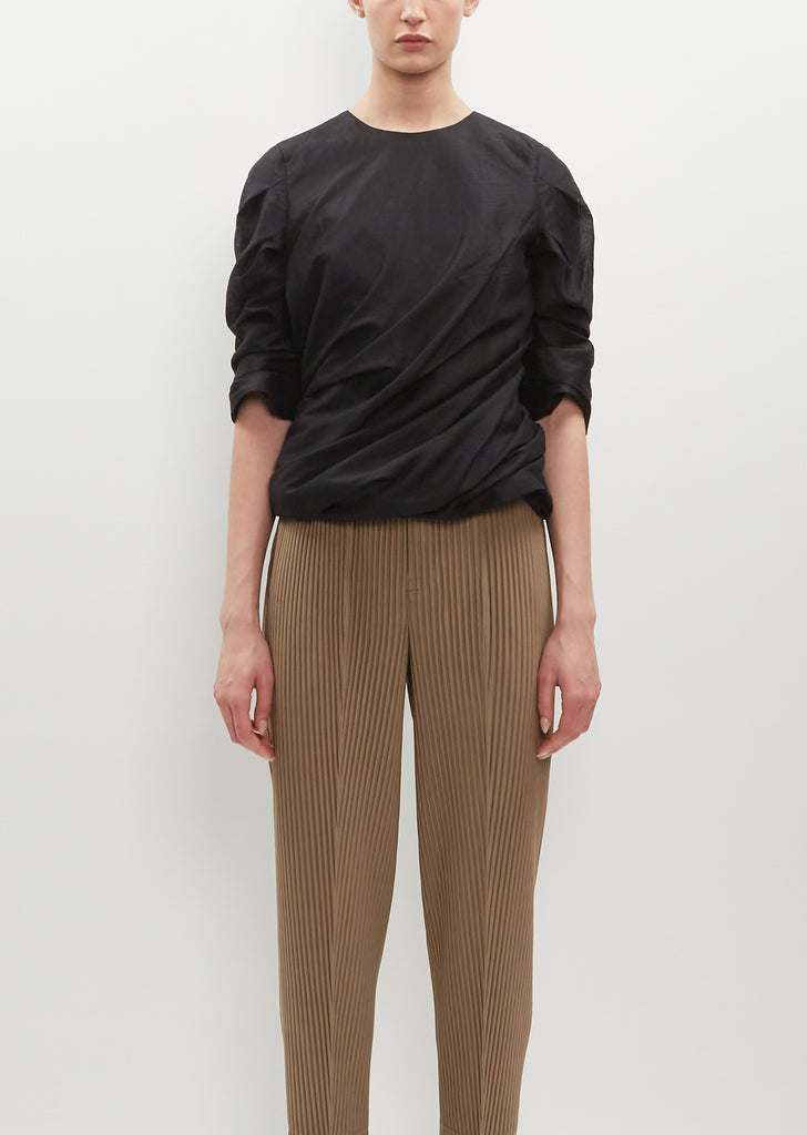 Issey Miyake black top with all over draping at bodice and elbow-length sleeves in ramie and cotton blend fabric. Covered button closure at back neckline.
