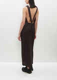 Issey Miyake black pleated dress with a low back in a textured polyester fabric. Features a V-neckline and wide crossed shoulder straps finished with knots at back.