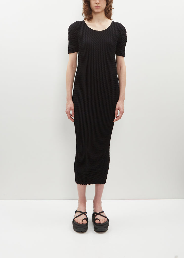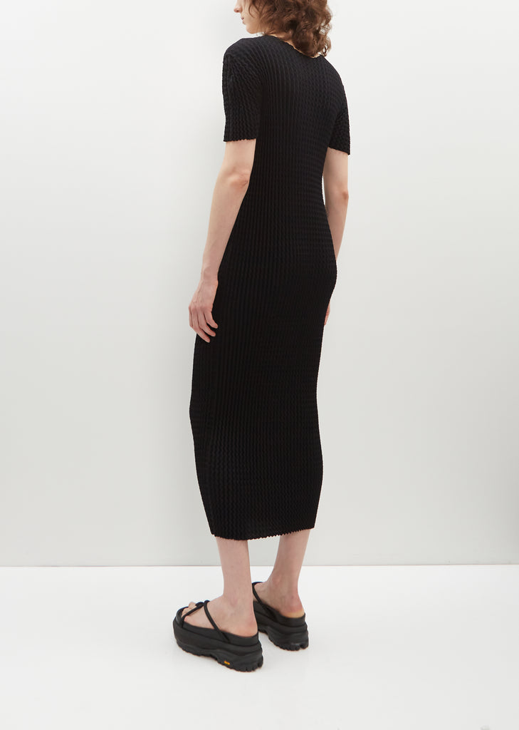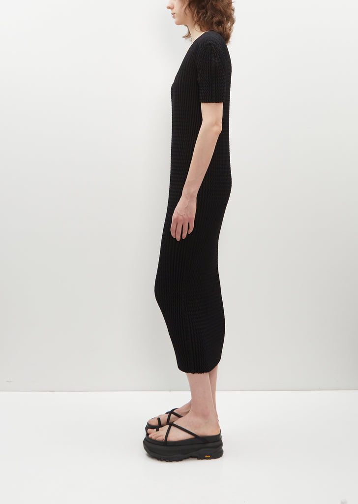 Issey Miyake black short sleeve dress in signature spongy pleats. Features a scoop neckline, longer short sleeves and midi-length hem. Closer fit.