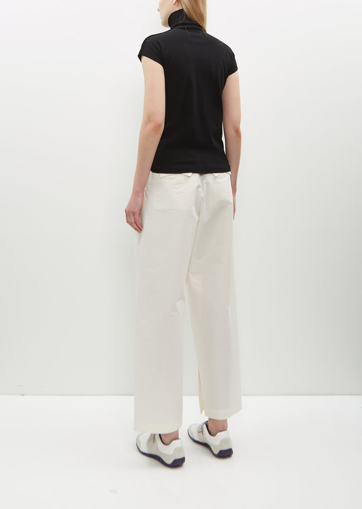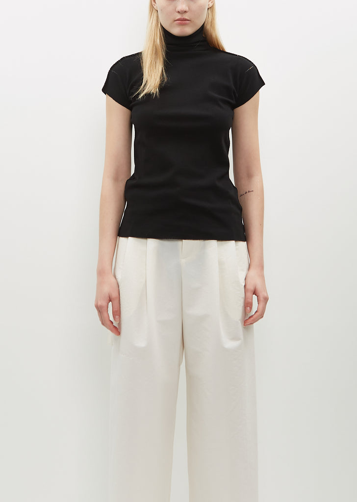 Issey Miyake black cap sleeve pullover with a high neck in stretch nylon and cotton blend knit.