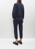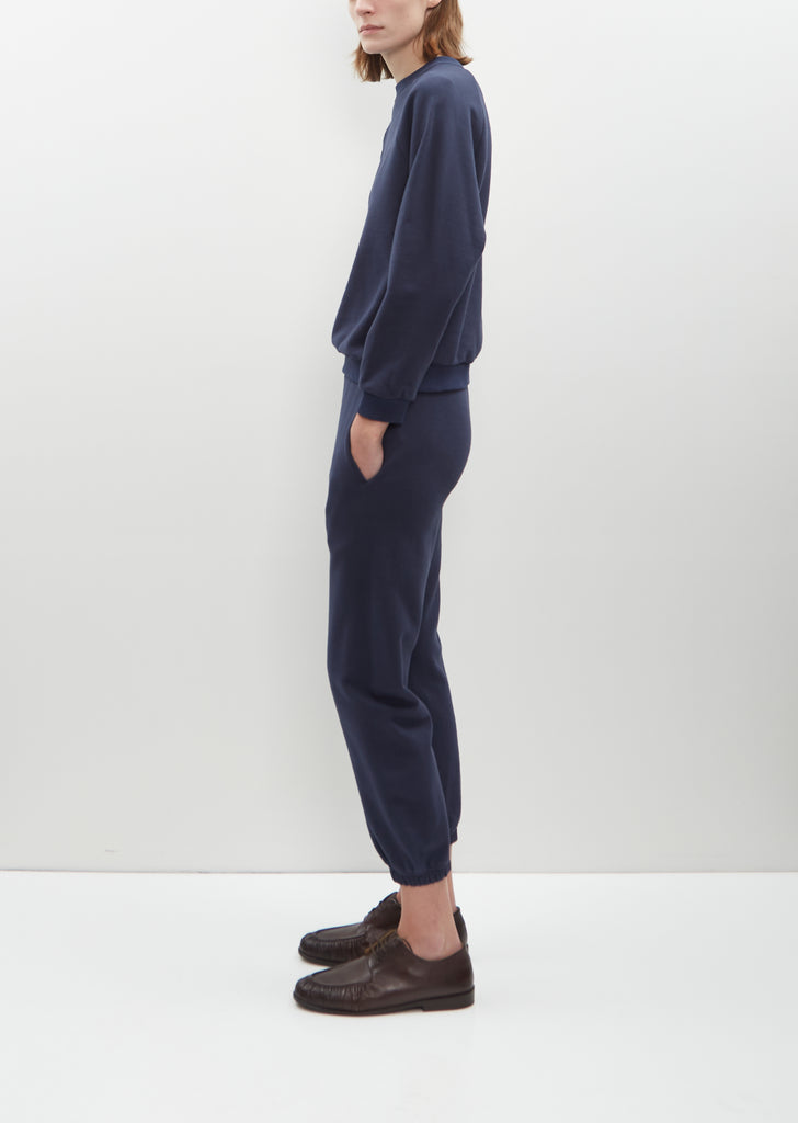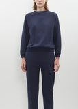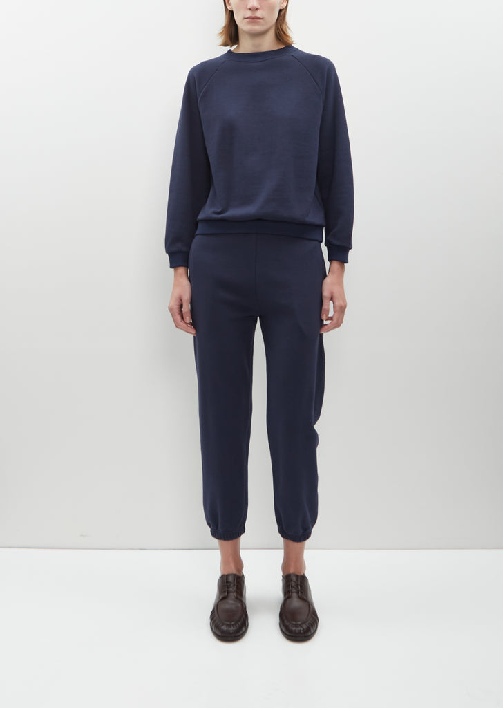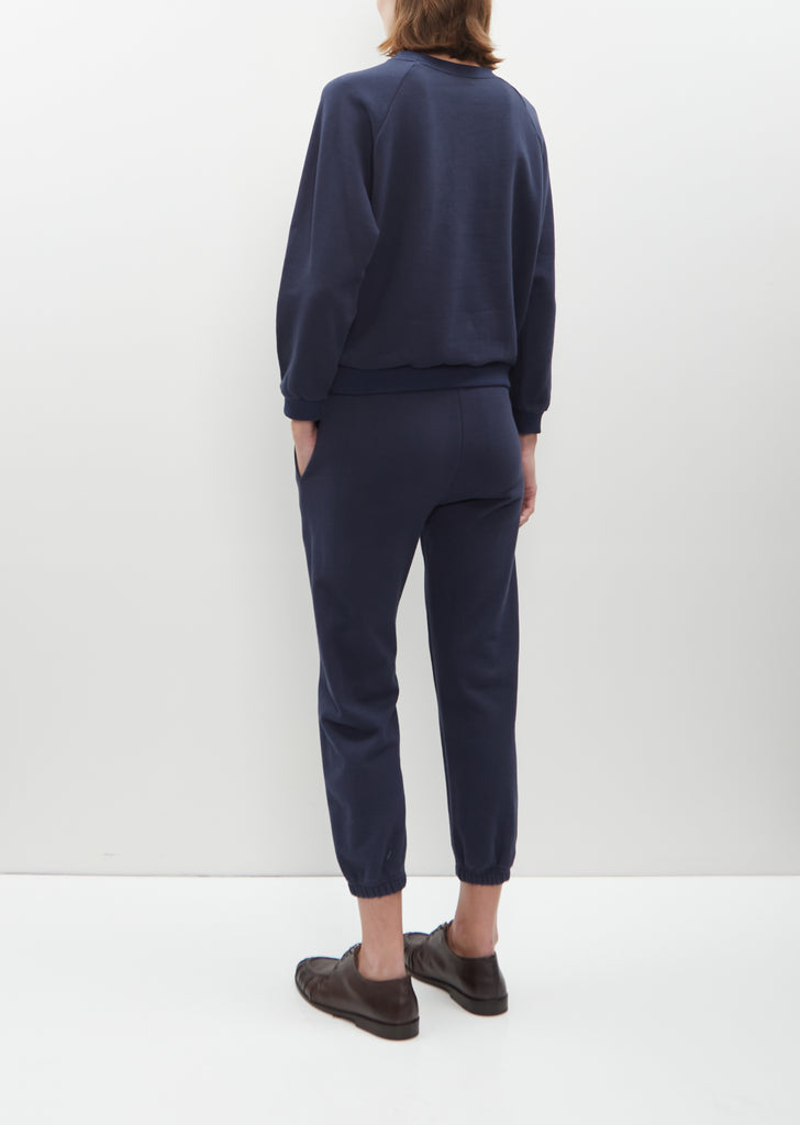 Signature, elevated everyday sweatshirt with a slightly shrunken fit in navy Japanese ultra-soft cotton fleece. Features cropped raglan sleeves and matching rib trim at neckline, sleeve cuffs and hem.