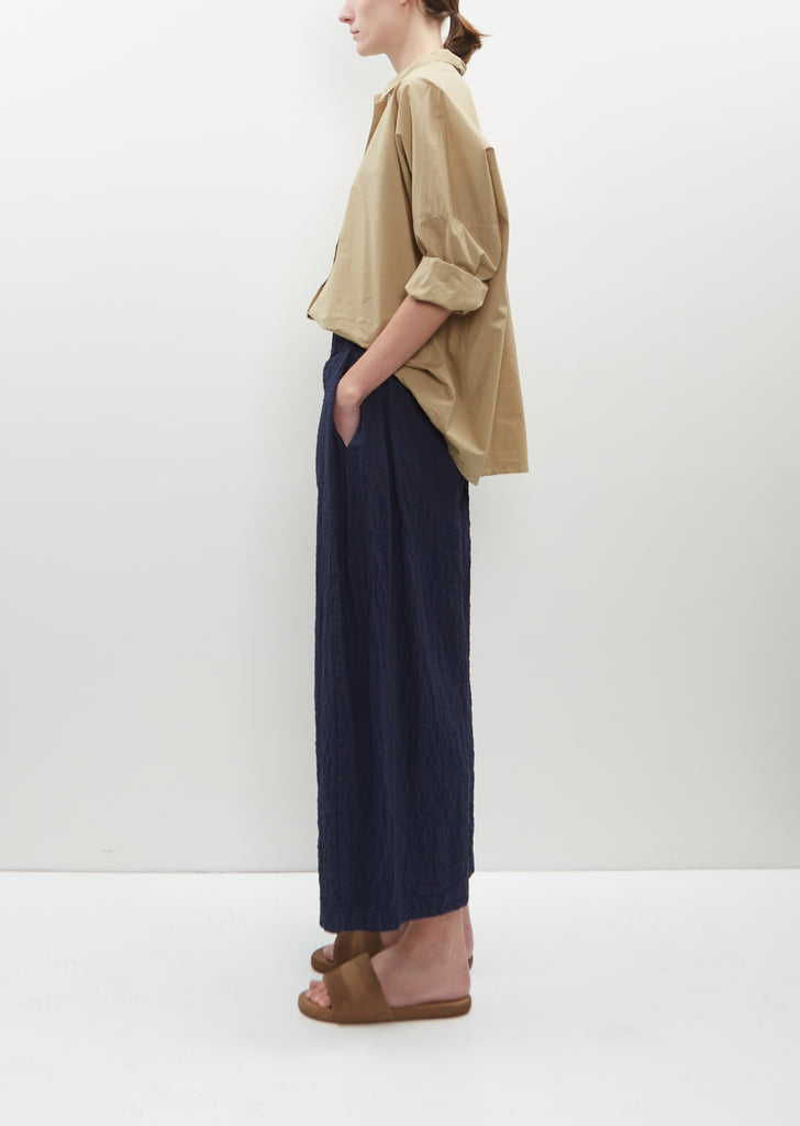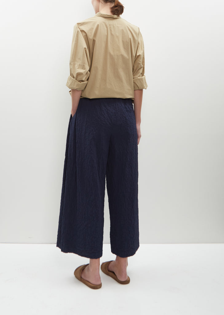 Labo.art navy cropped, wide leg trousers with an elasticated waist in a textured, crinkle cotton. Slash side seam pockets. Easy, pull on fit.