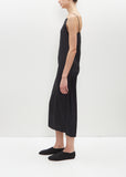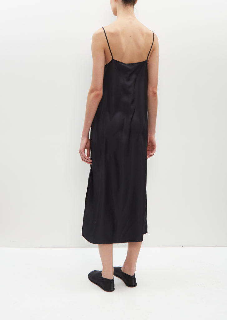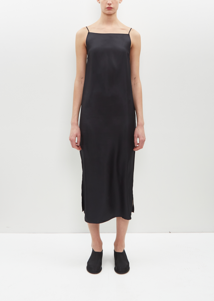 Loulou Studio black slip dress with thin fixed straps and a square neckline in satin silk twill. Features darts at chest, side slits and a concealed zip closure at side seam.