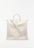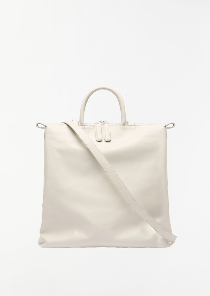 Icons Collection — Marsèll mist white unisex tote with double top handles and removable and adjustable shoulder strap in leather. Fully lined in canvas fabric with single interior compartment with leather piped slit pocket and exposed zip pocket. Exposed zip top closure. Finished with a folded base in self, gunmetal toned hardware, and an attached leather hangtag.