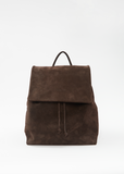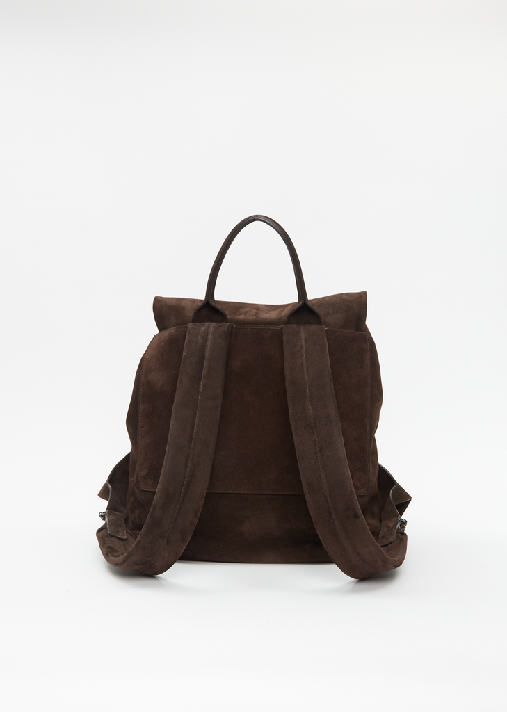 Marsèll dark brown backpack with a square fold over top and drawstring closure with  knotted ends in suede leather. Features a tonal suede leather top handle, padded adjustable shoulder straps and a single interior zipper pocket. Lined in tonal fine leather.