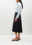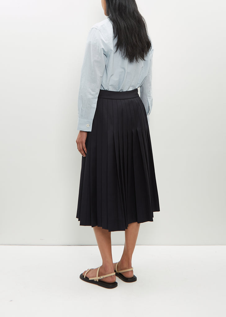 Margaret Howell ink navy classic kilt skirt with side pleats in a wool blend. Features a wrap construction with button closure to one side. Fully pleated back panel.