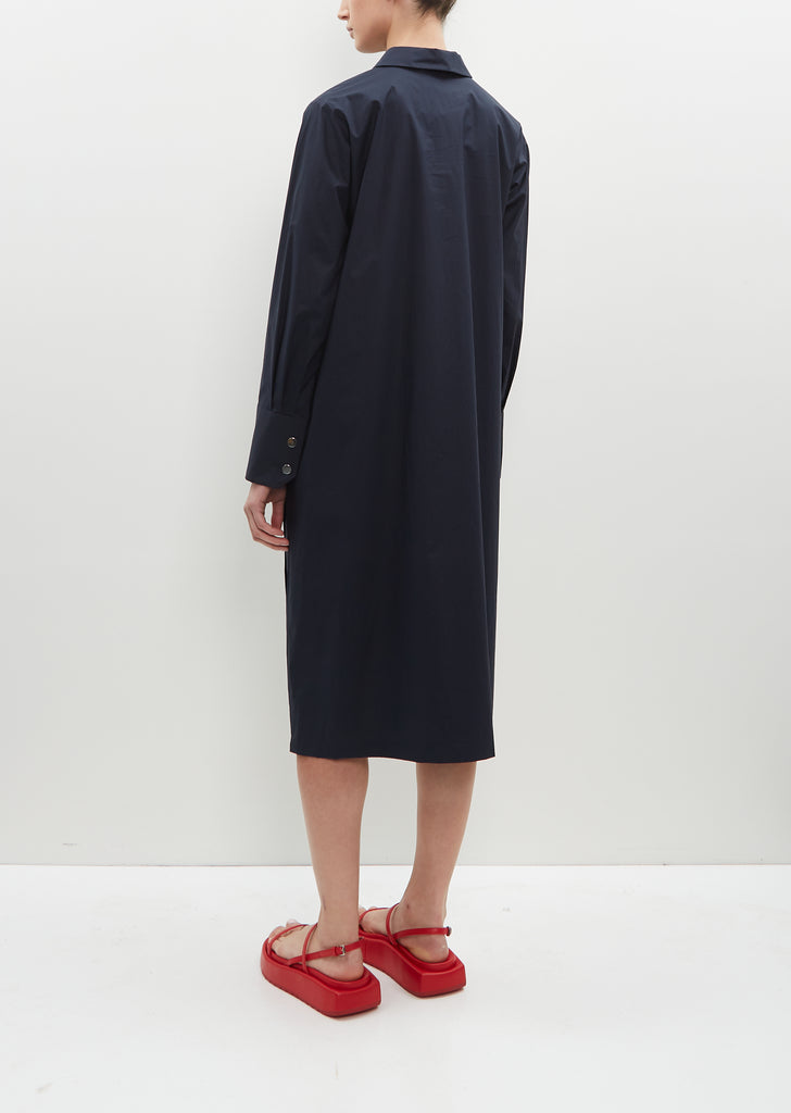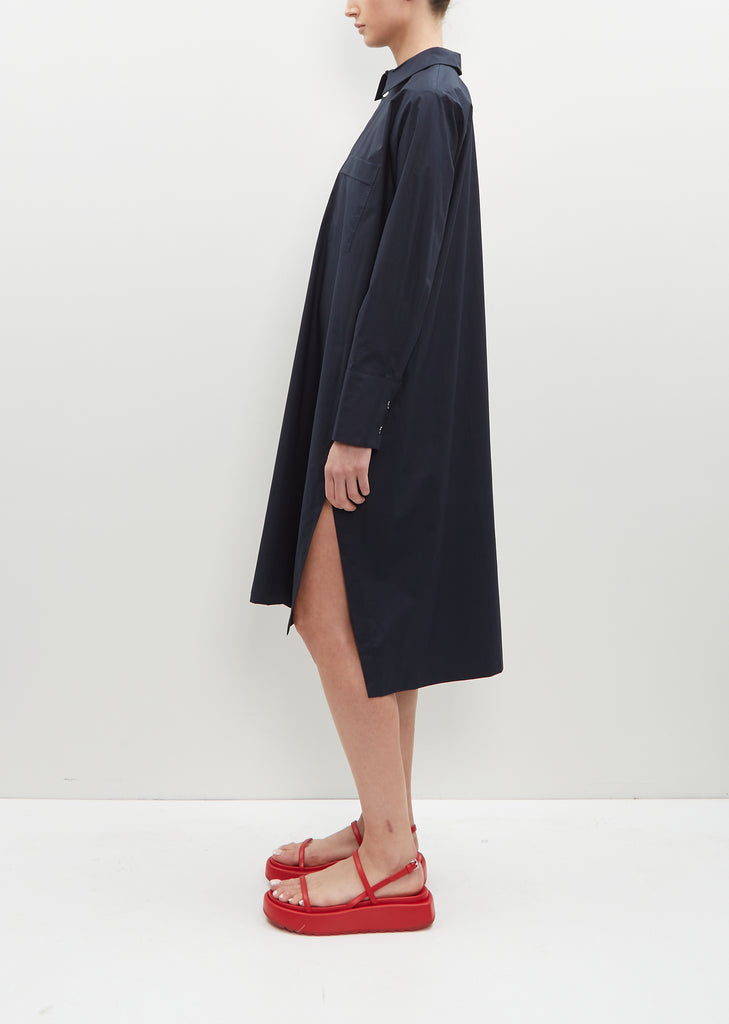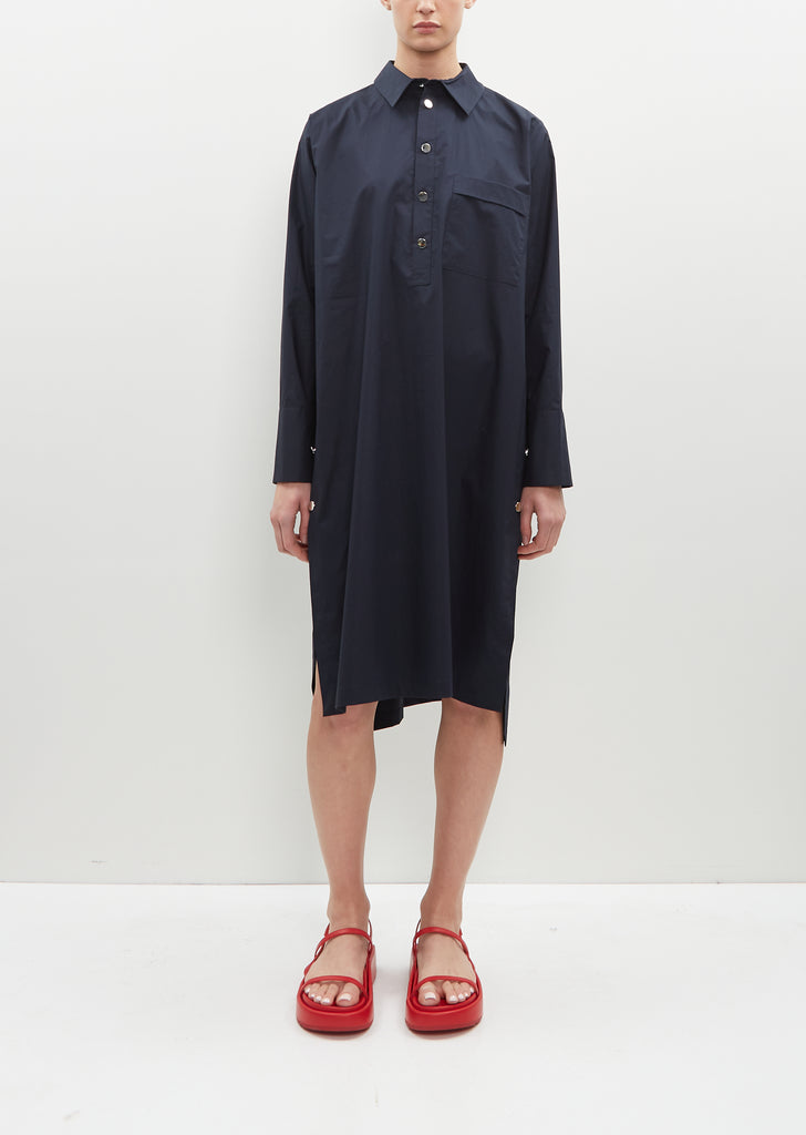 Plan C dark navy shirt dress with silver buttons and a split elongated hem in cotton poplin. Features a shirt collar, long buttoned cuffs, a single chest patch pocket and a three quarter button closure at front. Relaxed fit.