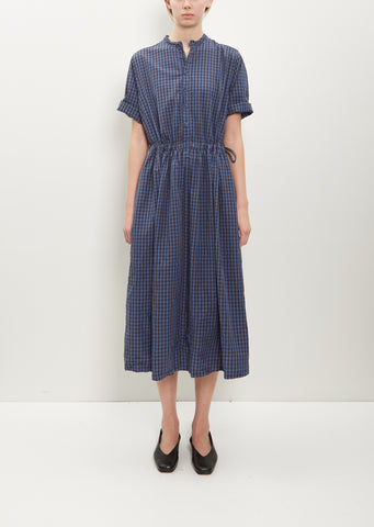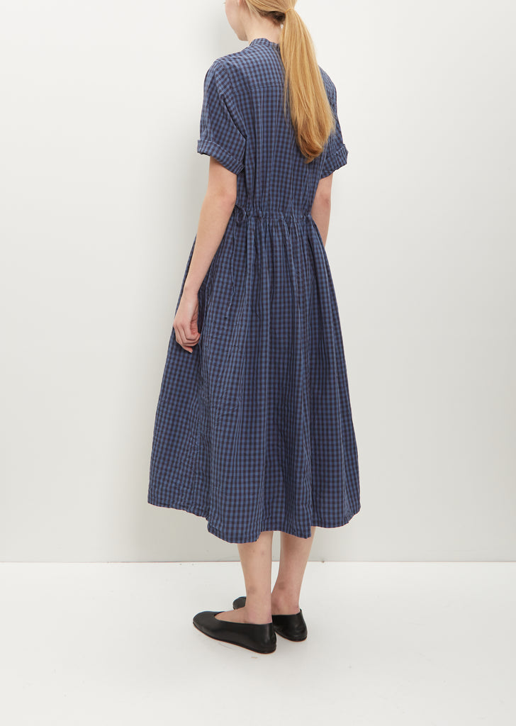 Pas de Calais blue gingham checks collared shirtdress with a ruched waist skirt in yarn dyed lightweight cotton with a crinkle effect. Features a band collar, an adjustable drawstring at waist, a back yoke, concealed side seam pockets and a tonal fabric buttons closure.