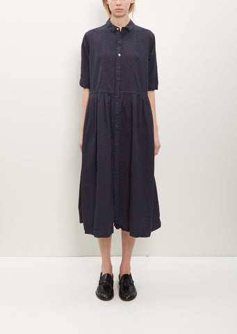 Pas de Calais navy blue collared shirtdress with a pleated waist skirt in naturally dyed lightweight cotton twill with a crinkle effect. Features side seam pockets, an adjustable interior drawstring at waist, buttoned cuffs and concealed pearl hued buttons closure.