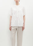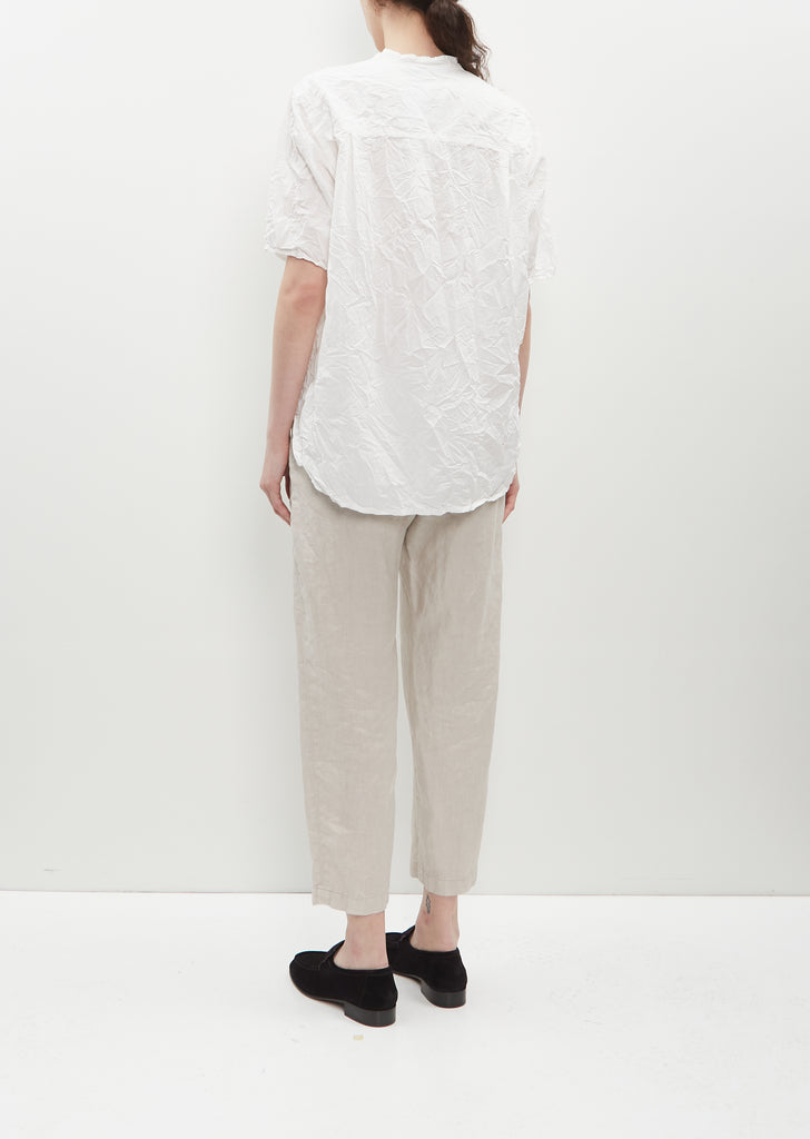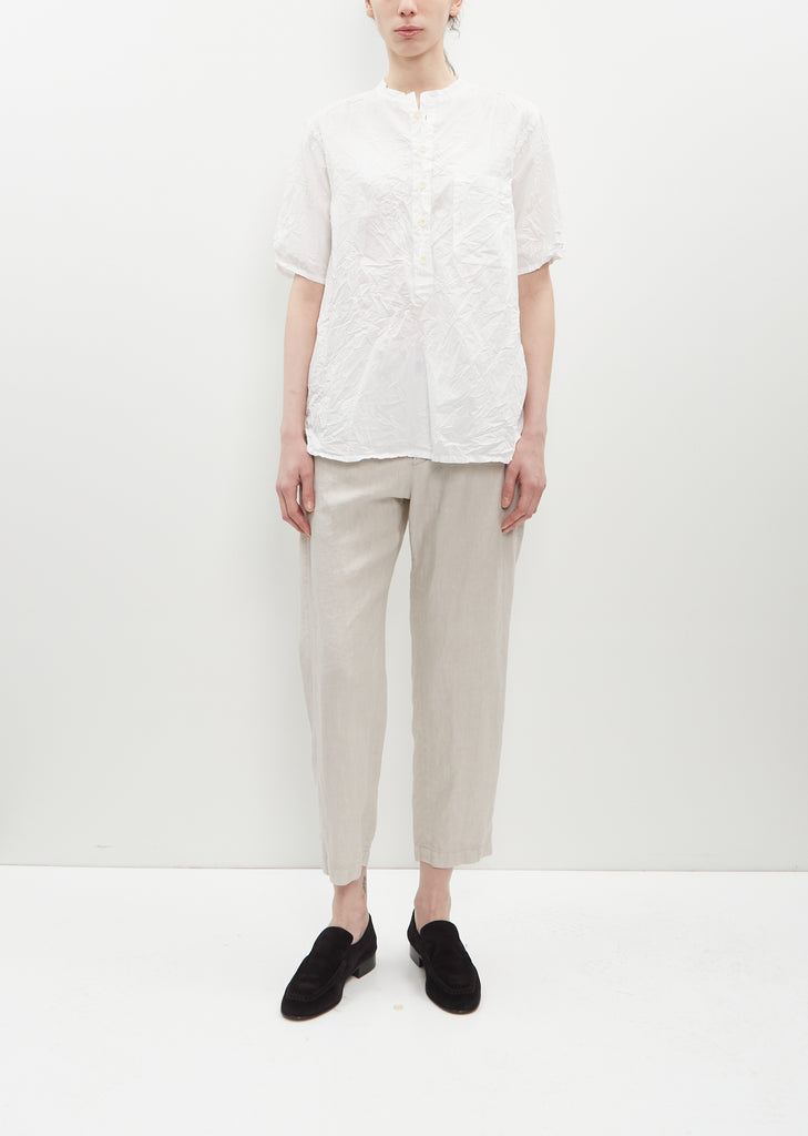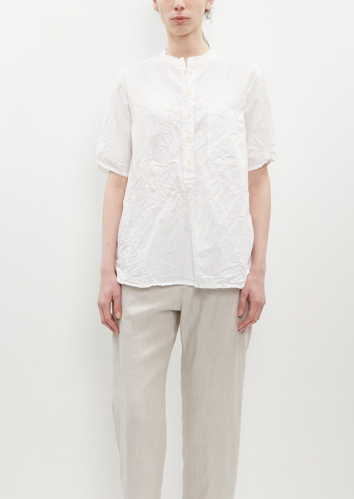 Pas de Calais white blouse with a band collar and a trim placket in naturally dyed lightweight cotton twill with a crinkle effect. Features tonal stitching, a patch pocket at chest, a back yoke, subtle side slits and contrast buttons closure.