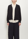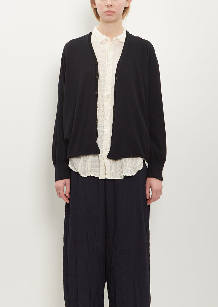 Pas de Calais black V-neck cardigan with openwork side details in cotton and linen knit. Features rib trim neckline, cuffs and back hem and rolled edge front hem. Finished with a horn hued buttons closure.