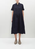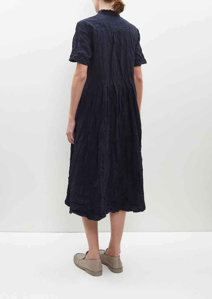 Pas de Calais signature crinkled shirtdress in natural dyed navy cotton with slight stretch. Features a small ruffled band collar, short sleeves and pleated skirt. Half buttoned placket closure with tonal white shell buttons. Concealed side seam pockets. Easy, popover fit.