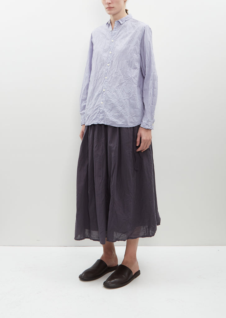 Pas de Calais signature crinkled shirt in natural dyed light blue cotton with slight stretch. Features a small collar, pleated cuff sleeves and curved side hem. Straight cut with a regular fit.