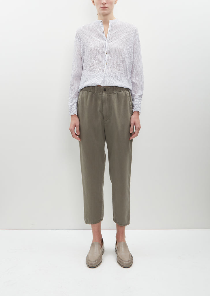 Pas de Calais khaki cropped trousers with tapered, slim legs in a fluid cotton and rayon blend. Features an elasticated waist, slash side pockets and belt loops. Button and zip fly fastening. Easy, slim leg fit.