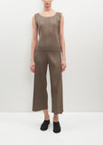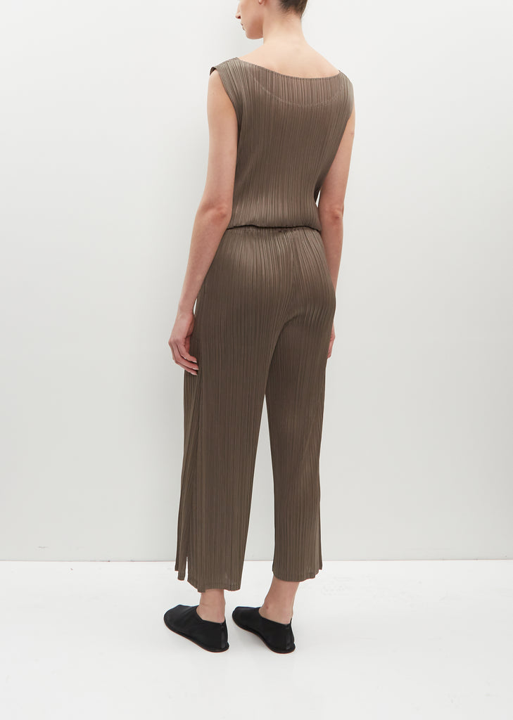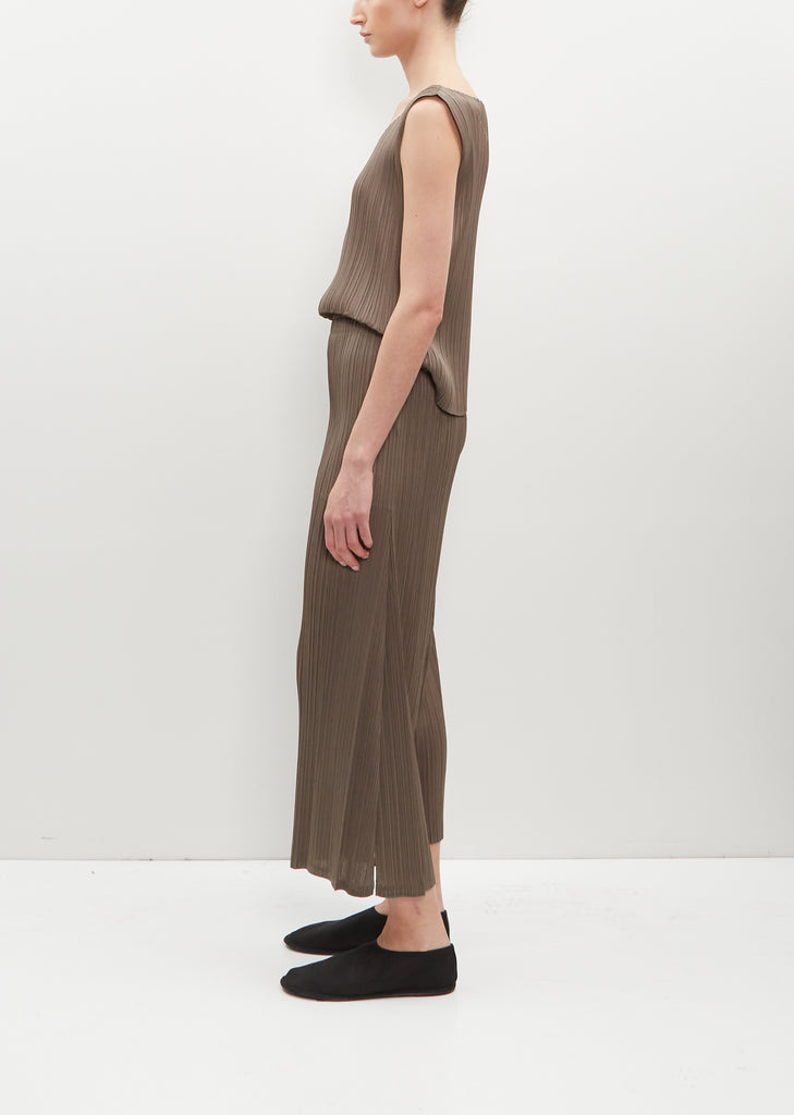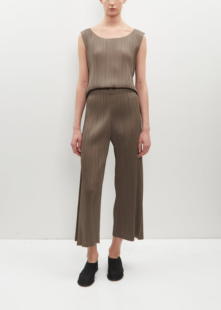 Pleats Please Issey Miyake essential pleated trousers in khaki. Features an elasticated waist and paneled side slits at hem.