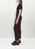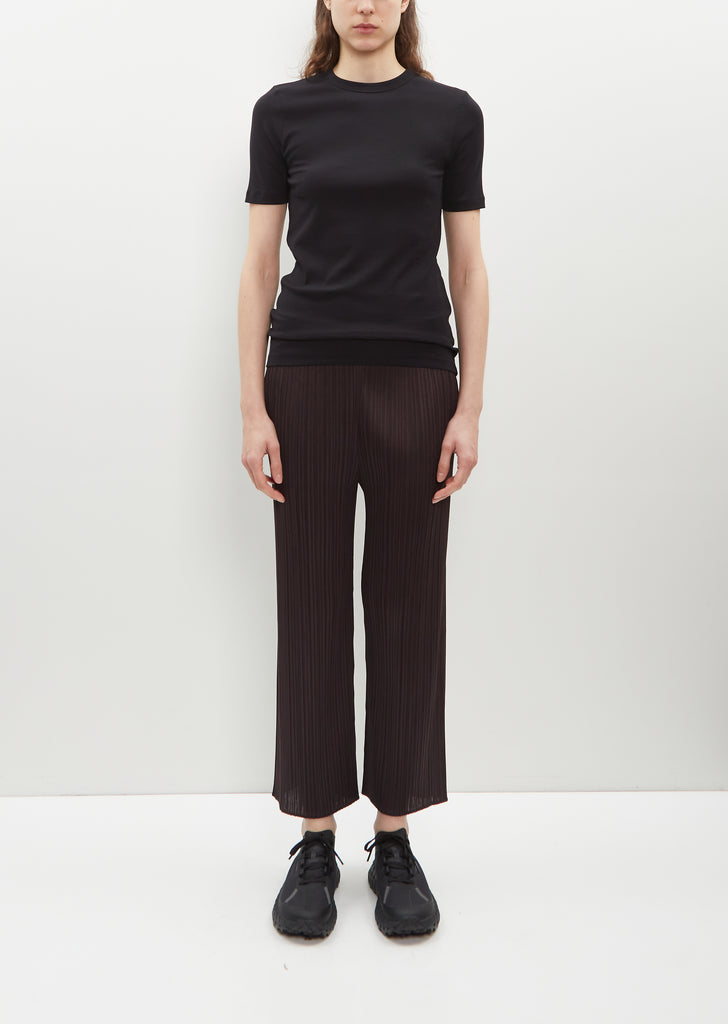 Pleats Please Issey Miyake dark brown cropped pleated trousers. Features an elasticated waist.