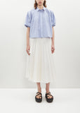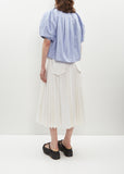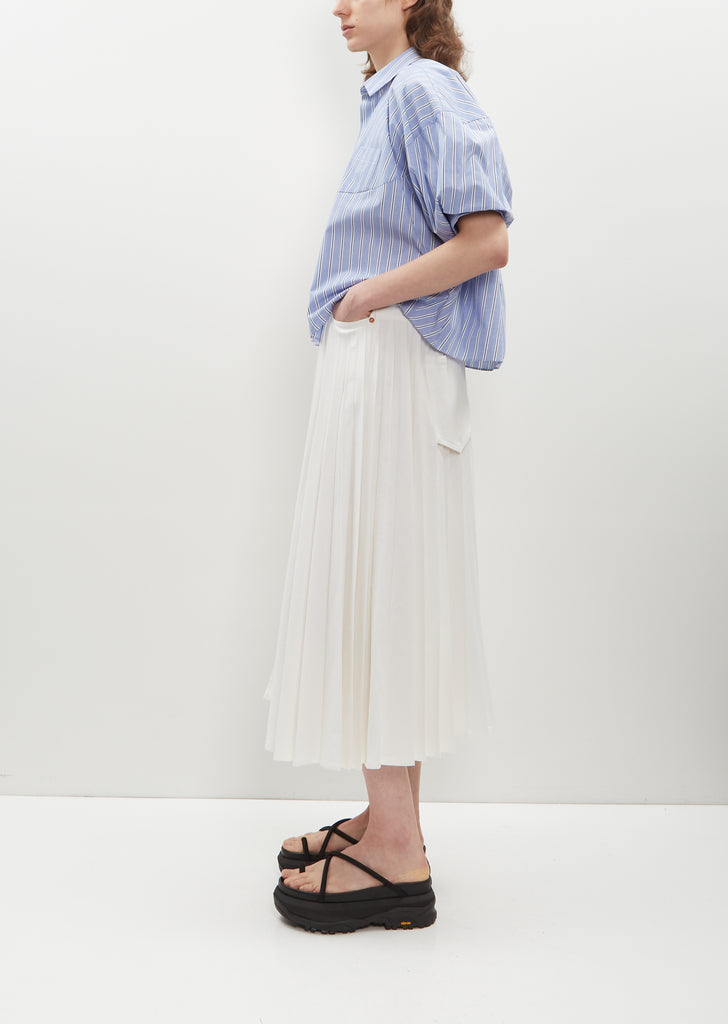 Sacai off white pleated A-line wrap skirt with self belt in cotton denim. Features scoop pockets at front and patch pockets with flaps at back. Rose gold tone grommet detail at front pockets and belt loops.