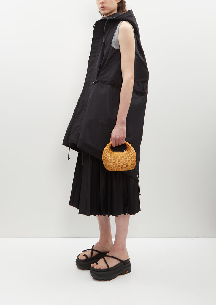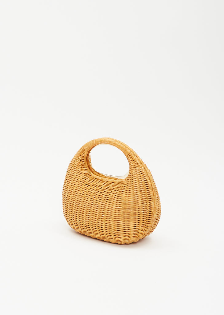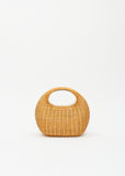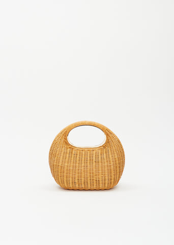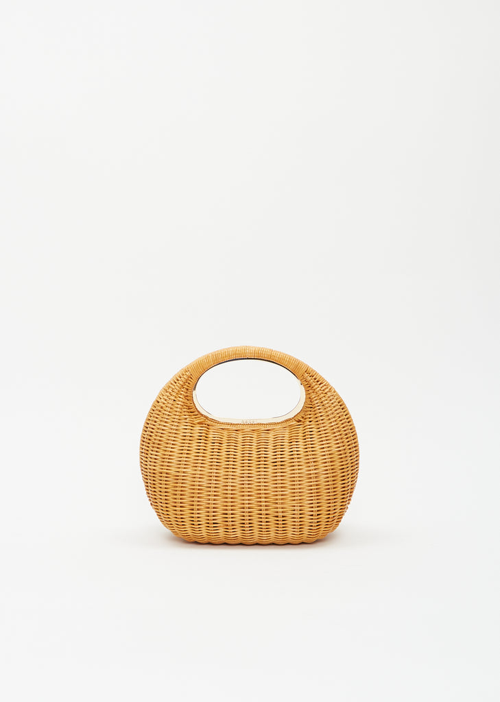 Sacai beige handbag with a solid double handle in rattan. Features a single interior slip pocket, brass hardware, top magnetic closure, engraved logo and a black cotton canvas lining.