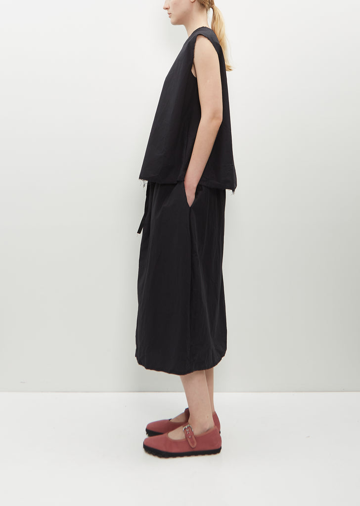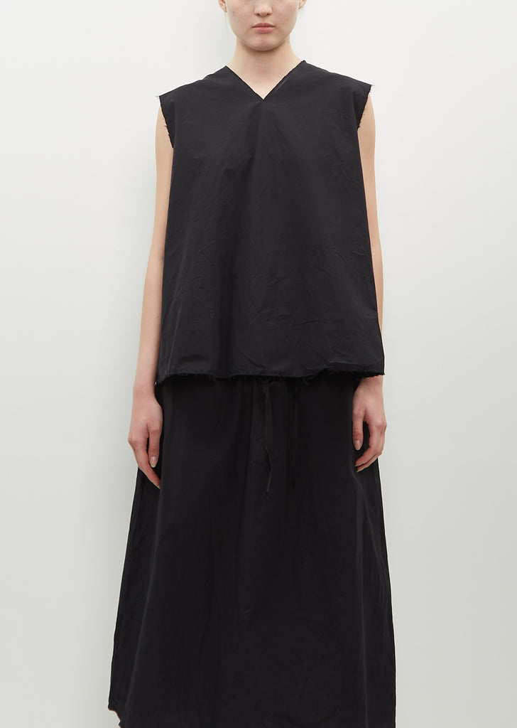 Scha black sleeveless top with a high V neckline in washed cotton poplin. Features a stitched raw edge trim finish at neckline, armhole and hems. Pops over.