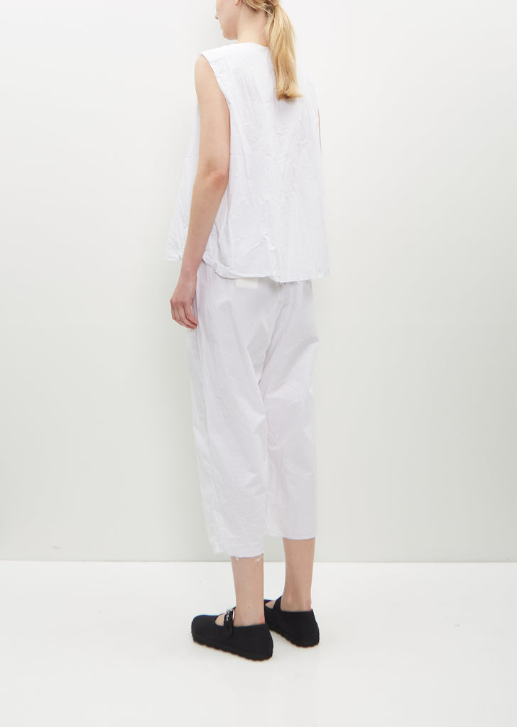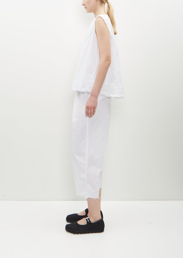 Scha white sleeveless top with a boat neckline in washed cotton poplin. Features a stitched raw edge trim finish at neckline, armhole and hems. Pops over.