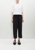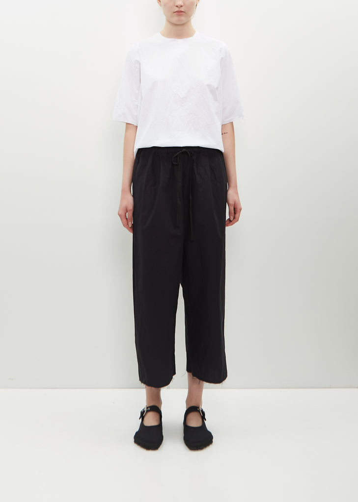 Scha black pull on trousers with a self drawstring waist and cropped, wide legs in washed cotton poplin. Features a stitched raw edge trim finish at hem, and hidden side seam pockets.