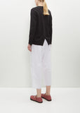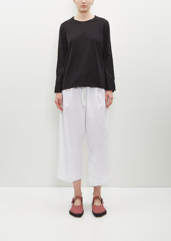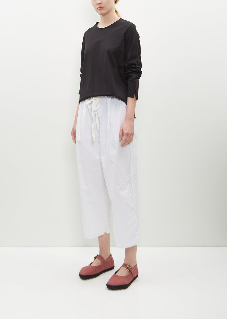 Scha white pull on trousers with a self drawstring waist and cropped, wide legs in washed cotton poplin. Features a stitched raw edge trim finish at hem, and hidden side seam pockets.