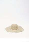 SCHA natural hat with a round crown in natural straw. Features a concealed wire inside of the brim edge, two long ribbons at crown and two interior ribbons that can be worn tied or hanging.