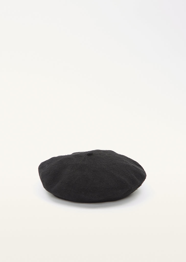 SCHA black beret in cotton and linen blend patterned knit. Features a rubber band at side for comfort.
