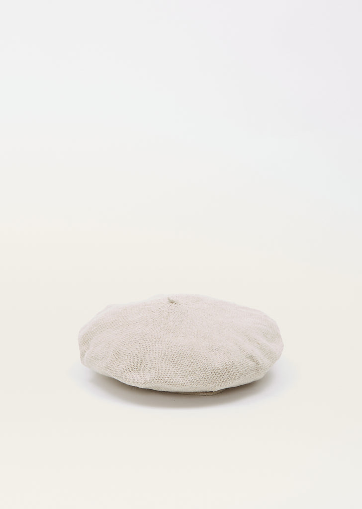SCHA natural beret in cotton and linen blend patterned knit. Features a rubber band at side for comfort.