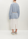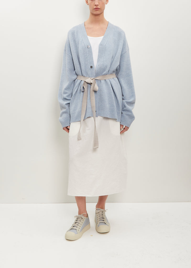 Sophie D'Hoore pale blue oversized V-neck cardigan with an optional light grey grosgrain belt in wool and cashmere knit. Rib trim finish at neckline, sleeve cuffs and hem. Finished with shell button closure at front. Clean side seam finish without belt loops.